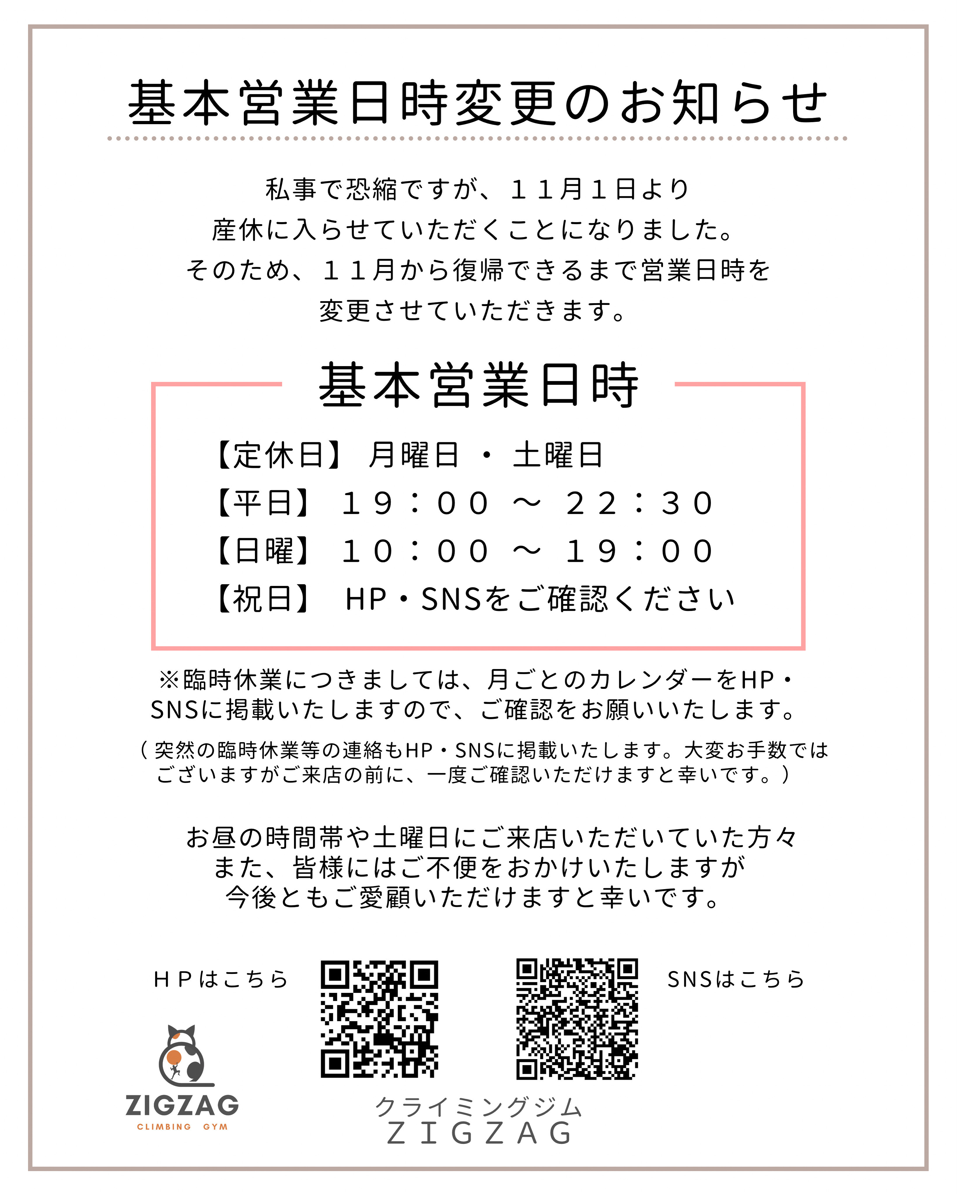 そのため、11月から復帰できるまで営業日時を変更させていただきます。