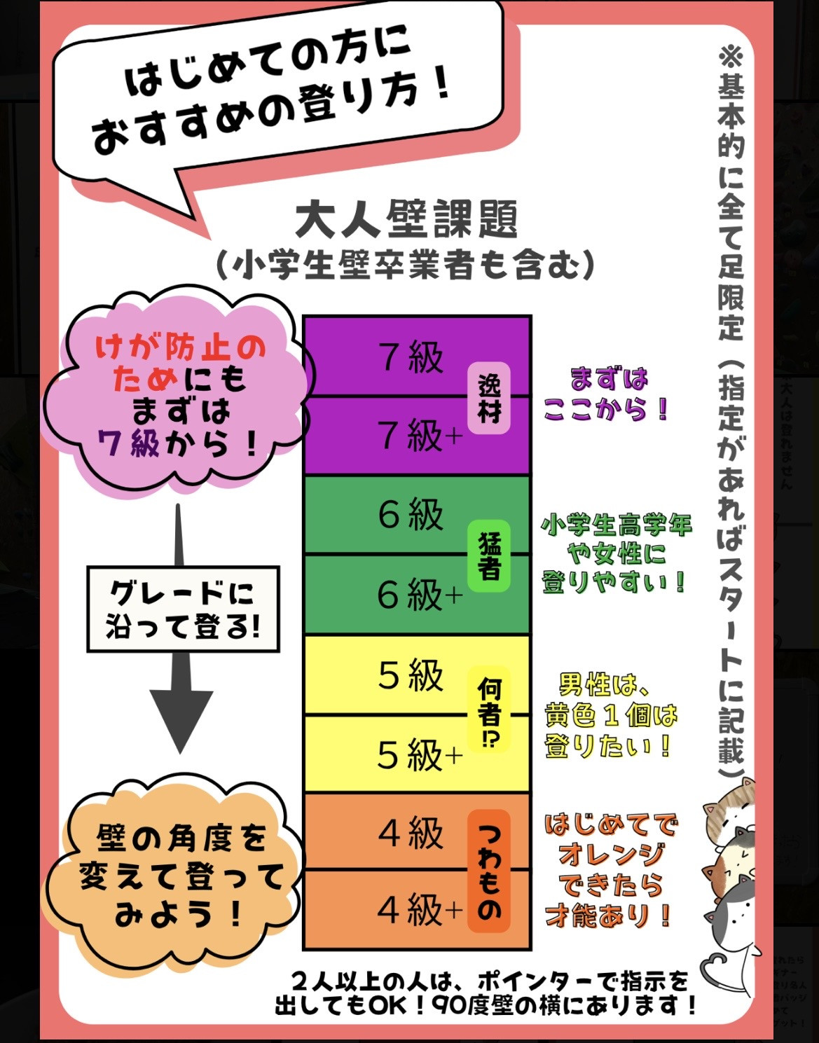 ●大人壁は、グレードを細かい表示にしました。今までの、きみどり〜青が、紫テープにまとめまった感じです。